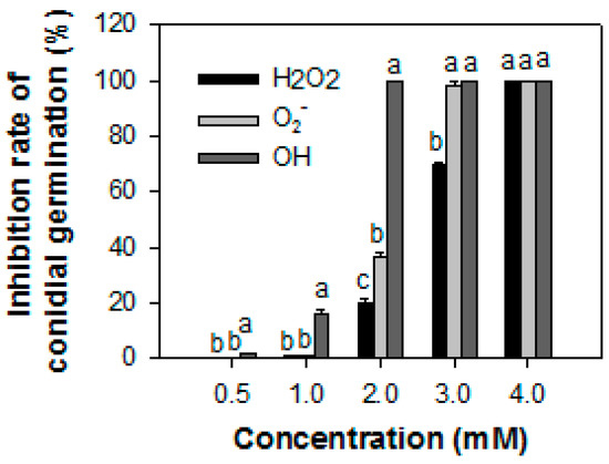 Figure 1 shows the effect of ROS on the conidial germination of Co. gloeosporioides (P13). The hydroxyl radical (·OH) was the most effective in inhibiting conidial germination. Treatment with ·OH ·destroyed 100% of the spores of P13 at 2 mM, whereas only 20.2% and 36.6% were destroyed by H2O2 and O2− at the concentration, respectively.