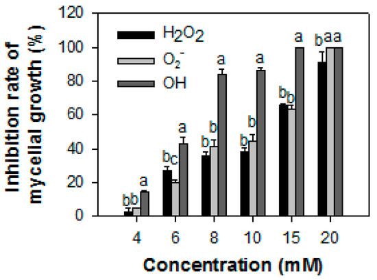 The antifungal activities of H2O2, O2−, and ·OH ·on the mycelial development of P13 in PJA are shown in Figure 2. Among these treatments, ·OH was the most effective at inhibiting mycelial growth. At 8 mM, treatments with ·OH, O2−, and H2O2 inhibited 84.0%, 41.1%, and 35.7% of the mycelial growth of P13, respectively.