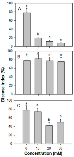 The effects of ROS on disease development caused by Co. gloeosporioides are illustrated in Figure 3. Treatment with H2O2 suppressed the development of Co. gloeosporioides on papaya fruit in a concentration-dependent manner (Figure 3A). Treatments with H2O2 at 20 or 30 mM, resulted in a disease index of 11.8% and 7.8% on papaya fruit, respectively, while that of the control fruit was 78.0% after 10 days of storage. O2− at all concentrations had no significant effect (Figure 3B). Treatment with 10 mM ·OH showed ineffective, whereas treatments with 20 and 30 mM ·OH significantly reduced the disease index (Figure 3C).