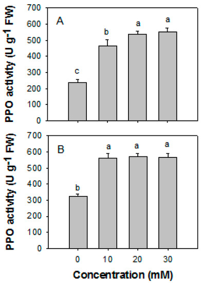 Numerous studies have shown that, upon exogenous elicitor treatment, plants exhibit enhanced activities of PPO and POD and an increased level of H2O2 that correlated with an increased resistance to diseases. Abouraicha et al. [26] reported that oligosaccharides trigger a rapid accumulation of H2O2 and an increase in the activities of PAL, PPO, and POD, as well as the levels of lignin and phenolic compounds, therefore, enhancing resistance to Penicillium expansum and Botrytis cinerea in apple (Malus domestica). Similar results have also been observed in strawberry (Fragaria × ananassa), with increased resistance to Botrytis cinerea following treatment with UV [27]. Chitosan treatment effectively enhances the activities of POD and superoxide dismutase, and levels of glutathione and H2O2, and significantly reduces the disease incidence of harvested navel oranges (Citrus × sinensis) [28]. Salicylic acid and methyl jasmonate induce the activities of PPO and POD and suppress green and blue molds in citrus fruit [29]. Ethanol activates defense responses in blueberry (Vaccinium sect. Cyanococcus) against Alternaria and Botrytis rots, by inducing the activities of defense-related enzymes, including POD, PPO, PAL, beta-1,3-glucanase, and chitinase [30]. Benzo-(1,2,3)-thiadiazole-7-carbothioic acid S-methyl ester (BTH), which can activate systemic acquired resistance in plants, increases the activities of PPO and POD, the levels of total phenolic compounds and H2O2, and disease resistance against Penicillium expansum in harvested peach (Prunus persica) fruit [31]. BTH treatment also markedly enhanced the accumulation of H2O2 and increased the activities of peroxidase while reducing the disease incidence in muskmelon (Cucumis melo) fruit [32].