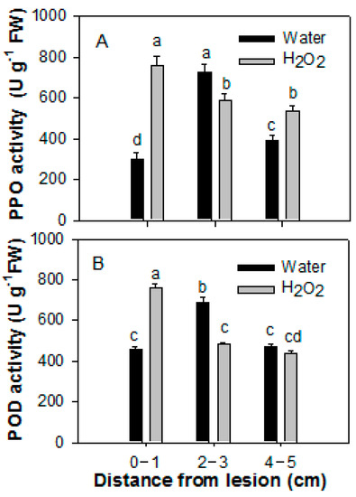Effect of 20 mM H2O2 treatment on the activities of PPO (A) and POD (B) of papaya fruit inoculated with Colletotrichum gloeosporioides. Papaya fruit were inoculated with Colletotrichum gloeosporioides immediately after H2O2 treatment. The pericarp tissue of papaya fruit inoculated with C. gloeosporioides were sampled after 8 days of incubation at 25 °C at 0–1, 2–3, and 4–5 cm from the lesions, respectively. POD, peroxidase; PPO, polyphenol oxidase. The data were expressed as the means ± SE of three biological replicates. Different letters indicate significant differences.