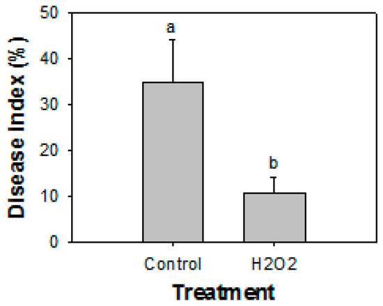 The application of H2O2 significantly (p ≤ 0.05) reduced the development of decay in papaya fruit in semi-commercial experiments. After 20 days of storage at 25 °C, the incidence of decay for non-H2O2-treated (control) fruit was 35%, whereas the fruit treated with 20 mM of H2O2 had an incidence of decay of 11% (Figure 6).