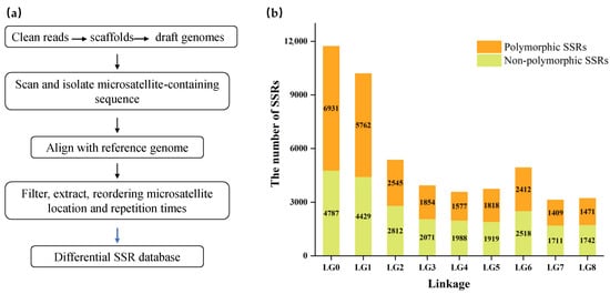 Construction of differential SSR database. (a) Flow chart of SSR marker development; (b) The number of non-polymorphic/polymorphic SSRs across the Chinese cherry genome in differential SSR database. LG0: the number of differential SSRs from the reads unmapped on LG1–LG8 were counted into LG0.