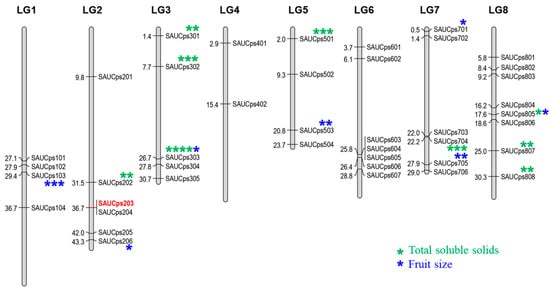 Fruit size and TSS content impact consumer acceptance and are considered as major selection criteria in cherry breeding. As glucose is the major sugar in cherry impacting TSS content [], we speculate that SAUCps303–330—close to glucose-associated peak signals in a previous study []—may serve as a potential functional marker for mining TSS-related genes. According to the genome annotation results of Chinese cherry, scaffold_2_3446 at 5.96 kb downstream of SAUCps206–171 is putatively homologous to the MSI4 gene which negatively regulates the cell cycle that may affect cell growth and division []. Additionally, scaffold_8_1115 is predicted as a homologous gene of SAUR20 [], which was speculated to increase fruit size by accelerating cell expansion in the mesocarp during the second rapid expansion period of Chinese cherry. The above results might contribute to the body of knowledge on the genetic control of important fruit traits in Chinese cherry.