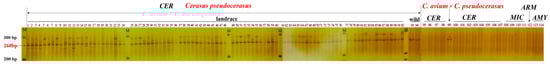 PCR profile of the SSR marker SAUCps203 with species-specificity in Cerasus pseudocerasus. Note: CER, Subgenus Cerasus; 1–94, C. pseudocerasus; 95–98, C. avium; 99, C. avium × C. pseudocerasus; 100, C. vulgaris × P./C. canescens and 101–102, C. vulgaris; 103–107, C. campanulate, C. yedoensis, C. serrulate, C. cerasoides, and C. mahaleb, respectively; MIC, Subgenus Microcerasus, including 108–111, C. humilis, C. glandulosa, C. japonica, and C. tomentosa, respectively; ARM, 112, Arm. mume; AMY: 113–114, Amy. persica and Amy. triloba, respectively (Table S2). The red arrow indicates the specific band.