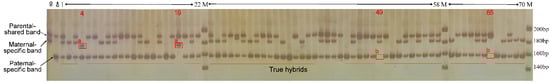 Five new SSR markers were selected for hybrid identification (Table S3) and the results of all primers were combined to confirm hybrid authenticity. The amplified bands of the hybrids were classified into three types: (I) paternal-specific bands; (II) maternal-specific bands; and (III) parental-shared bands. F1 seedlings with bands other than type I, II, or III were considered foreign origins. After excluding foreign origins, F1 seedlings with paternal-specific bands were considered true hybrids and individuals with the absence of paternal-specific bands were defined as maternal hybrids.