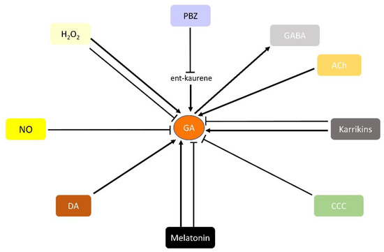 - Sponsel, V.M.; Hedden, P. Gibberellin Biosynthesis and Inactivation. In Plant Hormones; Springer: Dordrecht, The Netherlands, 2010; pp. 63–94. [Google Scholar]