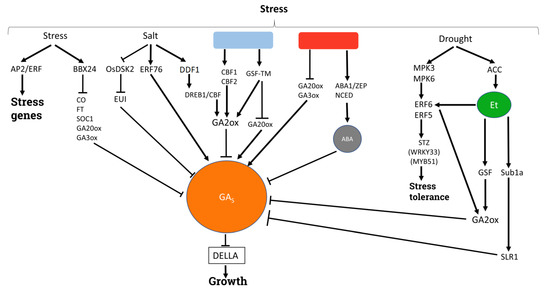 - Achard, P.; Cheng, H.; De Grauwe, L.; Decat, J.; Schoutteten, H.; Moritz, T.; Van Der Straeten, D.; Peng, J.; Harberd, N.P. Integration of Plant Responses to Environmentally Activated Phytohormonal Signals. Science 2006, 311, 91–94. [Google Scholar] [CrossRef]