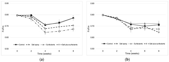 | Salt spray plus surfactant | 14.3 ± 0.3b | 11.2 ± 0.8b | 0.2 ± 0.0 | 179.0 ± 8.5b | 691.9 ± 19.5b | 33.2 ± 1.4 | 28.9 ± 2.6a | 51.8 ± 0.8b | 9.9 ± 0.5a | 7.3 ± 0.6a | 27.7 ± 1.2a | |