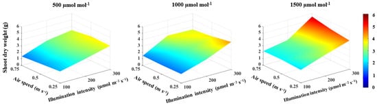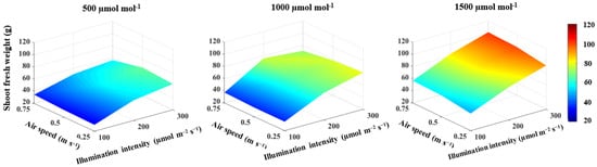 In terms of two-way interactions (Table 3), the most influential interactions were observed between CO2 concentration and illumination intensity (Table 3). Both CO2 concentration and illumination intensity are important in photo assimilation, which improves carbohydrate production and the growth of lettuce plants [47]. Lee and Park [41] also found that the growth and productivity of lettuce plants grown in a plant factory increased as the illumination intensity and CO2 concentration increased. The significant interaction between CO2 concentration and air speed can be explained by the low resistance in the leaf boundary layer caused by increased air speed over the lettuce canopy, which facilitated CO2 transport into the stomatal cavity during photosynthesis [25,51]. On the other hand, the significant interaction between illumination intensity and air speed can be explained by the two variables directly affecting the conductance of heat and water transfer through the leaf boundary layer [36]. The significant three-way interaction on the shoot fresh and dry weights confirms the critical role of CO2 concentration, illumination intensity, and air speed in the heat and gas exchange processes of lettuce plants with their surroundings.