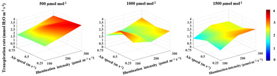In terms of three-way interactions, the results in Table 3 show a significant interaction effect on photosynthesis, transpiration and stomatal conductance. These interactions confirm that the integrative effects of CO2 concentration, illumination intensity and air speed have a significant impact on the gas exchange of lettuce plants grown under artificial lighting.