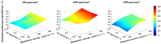 The correlation between the illumination intensity and transpiration rate and between illumination intensity and stomatal conductance was found to be positive (Table 1). Furthermore, the illumination intensity had a large effect size on both the transpiration rate and stomatal conductance (Table 1). The increase in illumination intensity from 100 to 300 μmol m−2 s−1 increased the transpiration rate and stomatal conductance by 34.9% (Figure 4) and 42.1% (Figure 5), respectively. The transpiration rate and stomatal conductance were negatively correlated with CO2 concentration and air speed (Table 1). The transpiration rate decreased by 17.5% when CO2 concentration increased from 500 to 1500 μmol mol−1 and by 12.8% when the air speed increased from 0.25 to 0.75 m s−1 (Figure 4). In general, the highest transpiration rate of 3.6 μmol H2O m−2 s−1 was observed at a CO2 concentration of 500 μmol mol−1, an illumination intensity of 300 μmol m−2 s−1 and an air speed of 0.25 m s−1 (Figure 4). Stomatal conductance increased by 33.5% when CO2 concentration increased from 500 to 1000 μmol mol−1, then decreased by 41.4% when CO2 concentration increased from 1000 to 1500 μmol mol−1 (Figure 5). An increased air speed from 0.25 to 0.75 m s−1 reduced the stomatal conductance by 15.3% (Figure 5). In comparison to the effect of CO2 concentration, increasing air speed had a small effect size on reducing stomatal conductance (Table 1). The highest stomatal conductance of 0.54 mol H2O m−2 s−1 was found at a CO2 concentration of 1000 μmol mol−1, an illumination intensity of 300 μmol m−2 s−1 and an air speed of 0.25 m s−1 (Figure 5). All two-way interactions were significant (Table 3). The most influential interactions were found in the photosynthetic rate. The effect size of the interaction between CO2 concentration and illumination intensity was 52%, while the effect size of the interaction between the illumination intensity and air speed was 67% (Table 3). Furthermore, there was a 3-way interaction on the photosynthetic rate, transpiration rate and stomatal conductance, with effect sizes of 51%, 26% and 13%, respectively (Table 3).