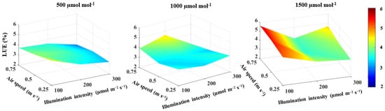 Light use efficiency was found to be significantly related to CO2 concentration and illumination intensity (Table 1). Light use efficiency increased by 19.6% with increasing CO2 concentrations from 500 to 1500 µmol mol−1, while it decreased by 19.1% with increasing illumination intensity from 100 to 300 µmol m−2 s−1 (Figure 6). There was no significant effect of air speed on the light use efficiency (Table 1).
