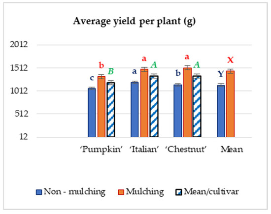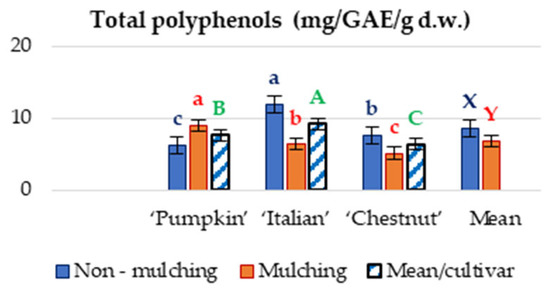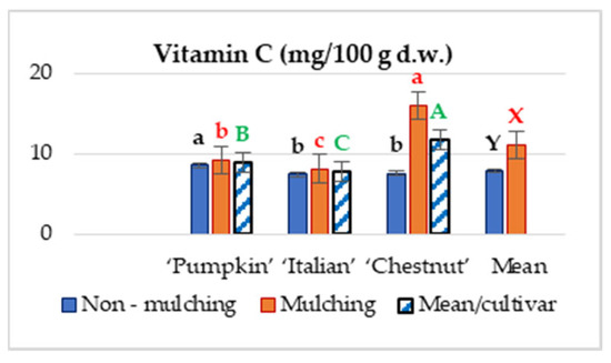 The analysis of the variance of the obtained results (Tukey’s multiple comparison test, p < 0.05) showed statistically significant differences in vitamin C content between the tested cultivars (Figure 5). The average vitamin C content increased in the following cultivar order: ‘Italian’ (7.46 mg/g d.w.), ‘Chestnut’ (7.58 mg/g d.w.), and ‘Pumpkin’ (8.62 mg/g d.w.) for the non-mulching variants. The values ranged between 8.16% in the ‘Italian’ cultivar to 16.0% in the ‘Chestnut’ cultivar in the mulched variants.