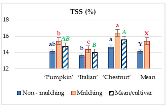 The total soluble substance (TSS) content, in the non-mulching variant, oscillated from 13.6% for the ‘Italian’ cultivar to 14.7% in the ‘Chestnut’ cultivar. The ‘Pumpkin’ cultivar also had a high content (14.1%) of TSS (Figure 3). Under mulching, the total soluble substance content for the same cultivar was higher. It should be noted that while the ‘Italian’ cultivar recorded the lowest value in the mulched version, it had 14.4% TSS.