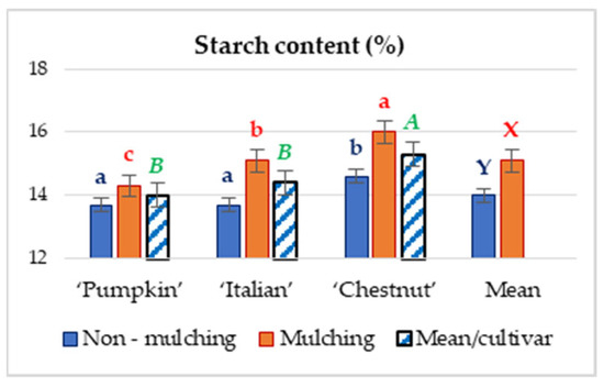 The starch content varied between 13.7–14.6% in the non-mulched variants and between 14.3–16.0% in the mulched versions (Figure 4). It was observed that the variation of this content depended on the cultivar, but the mulch also positively influenced the accumulation of starch.