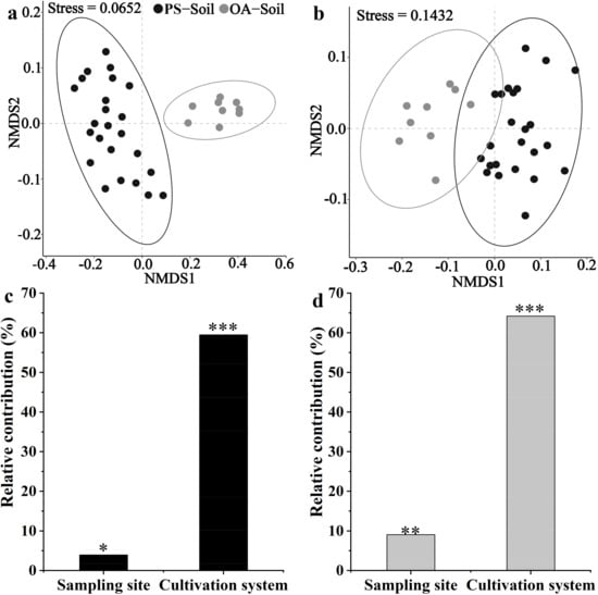 NMDS results also showed that the compositions of physicochemical and microbial properties between PS-Soil and OA-Soil were significantly (p < 0.05) different (Figure 1a,b). The differences in physicochemical and microbial properties between PS-Soil and OA-Soil were remarkably (p < 0.05) affected by sampling site and cultivation system, while the relative contributions of cultivation system on the differences in soil physicochemical and microbial properties were higher than that of the sampling site (Figure 1c,d).