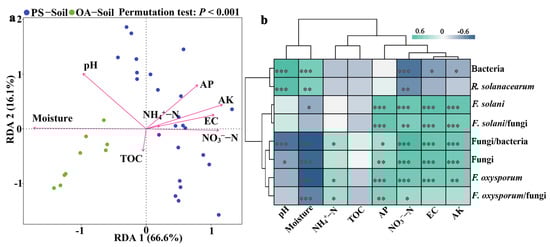 RDA (redundancy analysis) ordination plot (a) and correlation heatmap (b) showing the relationships between physicochemical and microbial properties in different soils. * p < 0.05, ** p < 0.01, *** p < 0.001, and a blank represents a nonsignificant (p > 0.05) correlation. The key from green (positive correlation) to blue (negative correlation) indicates the changes of Pearson correlation coefficients (r). EC: electrical conductivity; TOC: total organic carbon; AK: available potassium; AP: available phosphorus. PS-Soil and OA-Soil represent the plastic shed and open-air cultivation soils, respectively.