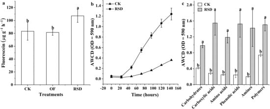 Compared with that in CK soil, the total microbial activity was significantly (p < 0.05) increased in RSD-treated soil, whereas the OF treatment did not affect microbial activity (Figure 3a). Moreover, RSD also significantly (p < 0.05) increased the microbial metabolic activity and changed the carbon source utilization pattern compared to that of CK soil (Figure 3b,c). The AWCD values of the carbon sources, such as carbohydrates, carboxylic acids, amino acids, phenolic acids, amines, and polymers, were considerably (p < 0.05) increased in the RSD-treated soil (Figure 3c).