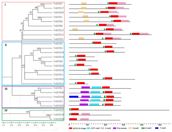 We next conducted a phylogenetic analysis to clarify the relationships among all putative GATA transcription factors from grapevine and Arabidopsis (Figure 1; Supplementary File Table S3). According to the four subgroups of GATA factors assigned from Arabidopsis, we identified 9 grapevines GATA factors in subgroup I, 10 genes in subgroup II, 5 genes in subgroup III, and 3 genes in subgroup IV. The eight grapevine GATA factors that had not previously been identified by Zhang et al. [27] were distributed among subgroups I, II, and IV (Figure 1). Two of the previously unidentified factors, VvGATA20 and VvGATA27, were included in a well-defined (99% of bootstrap replicates) clade with the previously identified VvGATA19 and two Arabidopsis genes, At4G17570 and At5G47140. An amino acid sequence alignment revealed that VvGATA27 was particularly closely related to At4G17570c (Figure 1 and Figure S2). In addition, VvGATA27 contained specific conservative motif ASXH belonging to subgroup IV as reported in Arabidopsis and pepper [14,34]. To characterize the VvGATA proteins further, conserved motifs were identified [35]. A total of seven conserved motifs were identified among the 27 GATA protein sequences (Figure 2; Supplementary Materials Figure S3). factors within the same subgroup were generally found to exhibit the same number of exons and similar intron-exon organization (Figure S3).