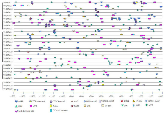Promoter cis-element analysis of VvGATA factors. The upstream promoter sequence (1.5 kb) for all VvGATA factors was evaluated for number and position of cis-elements as predicted by PlantCARE. The various elements are indicated by colored boxes and are shown in their corresponding positions on the promoter. Symbols presented above the line indicate the forward strand of DNA, while those below indicate the reverse strand.