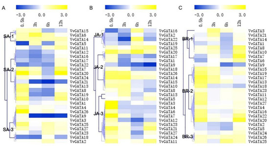 To further evaluate the potential roles of the VvGATA factors in hormone signaling pathways, we monitored gene expression in cell suspensions subjected to treatment with SA, MeJA, and BR (Figure 4). The expression data were placed in Additional File S1. For SA, the expression patterns could be divided into three groups (Figure 4A). Genes in group SA-1 showed a significant increase in expression at 3 h after treatment. Group SA-2 was upregulated at 12 h, but some were induced at 0.5 h followed by decreased expression thereafter, and others were downregulated at 0.5 h. In contrast, genes in group SA-3 exhibited a decline in expression from 0.5 to 3 h, then an increase in expression at 12 h after treatment. However, VvGATA1 and VvGATA3 were almost not induced under SA treatment. Under MeJA treatment, the majority of group JA-1 genes showed a slight increase at 0.5 h, except VvGATA9. Compared with 0.5 h under treatment, VvGATA17, VvGATA1, VvGATA9, and VvGATA18 showed low expression until 12 h. The remaining genes, in group JA-3, showed an increase at 0.5 h and decreased at 3 h after treatment, with varying responses thereafter. Meanwhile, VvGATA3, VvGATA4, and VvGATA7 were remarkably induced at 0.5 h. Three response groups could also be distinguished for BR treatment. In group BR-1, expression showed a bimodal response, with increases at 3 h and 12 h. Group BR-2, comprising 13 genes, most exhibited an early increase in expression, but VvGATA9, VvGATA2, and VvGATA5 were downregulated at 0.5 h after treatment. Group BR-3 genes increased from 0.5 to 3 h, then decreased immediately at 6 h after BR treatment (Figure 4C).