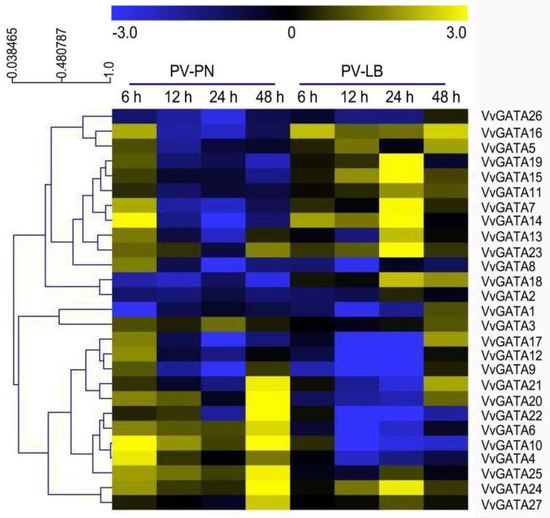 To understand the potential roles of the VvGATA factors in resistance to powdery mildew, we assessed their expression following inoculation with P. viticola, both in the susceptible cultivar ‘Pinot noir’ (PN) and the resistant genotype V. piasezkii ‘Liuba-8′ (LB). Expression was evaluated as described by Liu et al. [1]. The expression data were placed in Additional File S1. In ‘Pinot noir’, most genes showed an increase in expression at 6 h post infection (hpi) and showed low expression levels at 12 and 24 h after inoculation. Additionally, VvGATA14 and VvGATA10 were strongly induced, and VvGATA1 was significantly downregulated by 6 hpi. This indicates that most VvGATA genes were quickly responsive to inoculation. Meanwhile, a subset of genes (VvGATA21, VvGATA20, VvGATA22, VvGATA6, VvGATA10, VvGATA4, VvGATA25, VvGATA24, VvGATA27, and VvGATA14) was strongly induced at 48 hpi (Figure 5). Moreover, VvGATA11 was not sensitive to inoculation at any time point evaluated (Figure 5). The expression patterns in LB were different from those in PN in several respects. In LB, many of the VvGATA genes were initially non-responsive to inoculation at 6 hpi. Until 12 hpi to 24 hpi, a part of VvGATAs were repressed and showed extremely low expression levels. Especially, VvGATA9 was downregulated from 6 to 24 hpi. A group of VvGATA genes was upregulated by 12 to 24 hpi and dramatically induced at 24 hpi. However, the same group of genes was significantly downregulated in PN at 12 hpi to 48 hpi, indicating that these genes probably participated in plant resistance. Meanwhile, some genes show lower expression levels in PN than in LB at 48 hpi, including VvGATA22, VvGATA6, VvGATA10, VvGATA25, VvGATA24, and VvGATA27, indicating that these genes were likely to take part in plant susceptibility.