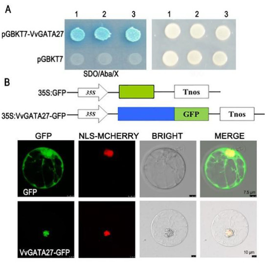 VvGATA27 transcription factor, which contained the ASXH motif, was first reported in grapes. To assess the transcriptional activation potential of VvGATA27, the CDS from V. vinifera cDNA was cloned into the pGBK-T7 vector used in the yeast GAL4 system, and the pGBK-T7-VvGATA27 construction was introduced into the yeast strain Y2H and grown on selective media (SD/-Trp). The clones carrying pGBKT7-VvGATA27 grew well and turned blue on selective single dropout (SD/-Trp) media in the presence of Aureobasidin A (Aba) and the chromogenic substrate (X-α-Gal), indicating that VvGATA27 has transcriptional activity in yeast (Figure 6A). To assess the subcellular localization of VvGATA27, the CDS was cloned into the pCAMBIA2300 vector as a fusion to green fluorescent protein (GFP), and the plasmid was introduced into V. vinifera protoplasts using polyethylene glycol (PEG)-mediated transformation. VvGATA27-GFP fusion proteins and GFP (as a negative control), together with NLS-mCherry, which was used as a nuclear-localized marker, were co-expressed in V. vinifera protoplasts. Confocal microscopy revealed that the VvGATA27-GFP fusion protein was localized to the nucleus (Figure 6B).