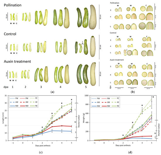Morphological changes in Cavili, MUCU-16, and Whitaker genotypes after auxin, pollination, and control treatments for 5 days post anthesis. Whole fruit (a) and central (transversal cut) and stylar (longitudinal cut) sections (b). 1 In Whitaker, both phenotypes were found, mostly the smallest phenotype (84%). Mean length (c) and weight (d) of each sample for 5 dpa with the market standards categorized in S (small: 7–14 cm; 50–100g), M (medium: 14–21 cm; 100–225 g) and L (large: 21–30 cm; 225–450 g). Pollinated (P), Auxin-treated (A), Non-treated (N) Whitaker (W), MUCU-16 (M) and Cavili (C) genotypes. * Significative differences between samples (p < 0.005). Error bars are standard errors (n ≥ 8).