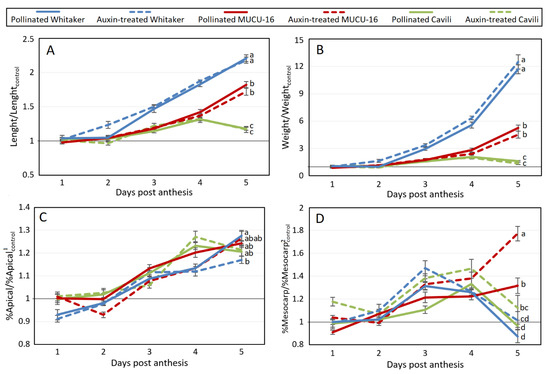 Fruit morphological changes versus non-treated fruits. Length (A), Weight (B), Apical shape (C) and Mesocarp width (D) of the auxin-treated (A) and pollinated (P) fruits compared with the non-treated fruits, in the Whitaker (W), MUCU-16 (M) and Cavili (C) genotypes for 5 dpa. 1 %Aplical (cmapical/cmcentral). 2 %Mesocarp (cmmesocarp/cmcentral). The line corresponded with the non-treated control value of each sample. Significative differences 5 dpa (ANOVA p < 0.05) are indicated with letters (Tukey HSD). Error bars are standard errors (n ≥ 8).