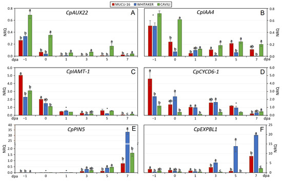 Normalized relative quantities (NRQ) in non-treated samples. Data represents the NRQ for genotypes MUCU-16 (red), Whitaker (blue) and Cavili (green) and days post anthesis −1, 0, 1, 3, 5 and 7 in each gen: (A), CpAUX22 (auxin-induced protein AUX22-like); (B), CpIAA4 (auxin-responsive protein IAA4-like); (C), CpIAMT-1 (indole-3-acetate O-methyltransferase 1-like); (D), CpPIN5 (auxin efflux carrier PIN-FORMED 5-like); (E), CpCYCD6-1 (cyclin D6-1-like); (F), CpEXPLB1 (expansin-like B1). Significative differences (ANOVA, p < 0.05) are indicated with letters (Tukey HSD). * No significative differences. Error bars are standard errors (n = 3).