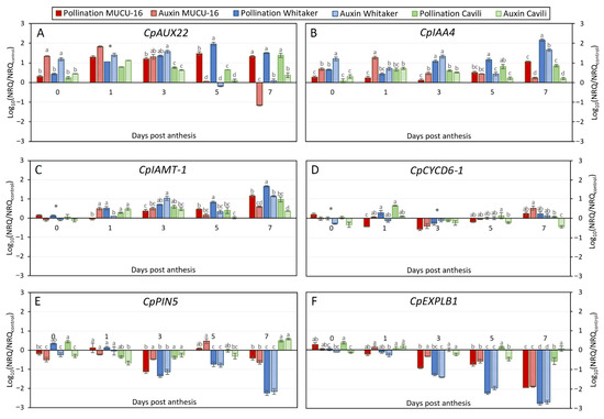 Differential gene expression after treatments in each genotype by day post anthesis. Data is represented by the Normalized relative quantities (NRQ) relativization of pollination and auxin-treatment versus the non-treated (NRQ control) with a logarithmic transformation: Log10(NRQtreatment/NRQcontrol). Positive values represent more expression in each sample than in the non-treated control, while negative values represent more expression in the non-treated control. Each unit is a 10-fold expression differential. (A) (CpAUX22, auxin-induced protein AUX22-like), (B) (CpIAA4, auxin-responsive protein IAA4-like), (C) (CpIAMT-1, indole-3-acetate O-methyltransferase 1-like), (D) (CpPIN5, auxin efflux carrier PIN-FORMED 5-like), (E) (CpCYCD6-1, cyclin D6-1-like) and (F) (CpEXPLB1, expansin-like B1). Significative differences (ANOVA, p < 0.05) are indicated with letters (Tukey HSD). * No significative differences. Error bars are standard errors (n = 3).