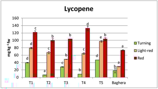 For lycopene and β-carotene content, differences were found among the studied varieties (Figure 5). Lycopene ranged from 6.57 mg kg−1 fw for T2 (turning) to 132.64 mg kg −1 fw for T4 (red). The highest significant lycopene content at turning and light-red was found for T5, whereas T4 was the variety with the highest concentration at red. All the traditional varieties showed higher lycopene content than the commercial hybrid ‘Baghera’ in the two last stages, although other authors found no differences between commercial and traditional varieties in the red stage []. Our tomato varieties showed higher carotenoid content than those reported by Pinela et al. [] in local farmers’ varieties from Portugal. Lycopene content varied significantly among tomato varieties [] and can be also affected by environmental factors and agricultural techniques [,]. Roselló et al. [] reported values from 2.72 to 73.77 mg kg−1 fw for five traditional varieties. In organic production, the average lycopene content has been reported at 56 mg kg−1 fw for 13 commercial varieties harvested at the fully ripe stage [], and Murariu et al. [] found that the lycopene content of red tomatoes ranged from 9.53 to 3.60 mg 100 g−1 fw depending on the genotype and the production system. The values obtained in this work were considerably higher than those reported by these authors, mainly in the red stage.
