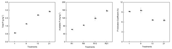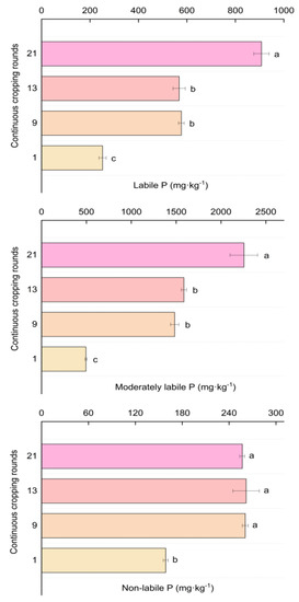 In this study, the continuous cropping rounds had no significant effect on the proportion of soil resin-P and NaHCO3-Po in total P, but the proportion of soil NaHCO3-Pi in total P decreased significantly from the 1st to the 21st cropping round (Figure 4).