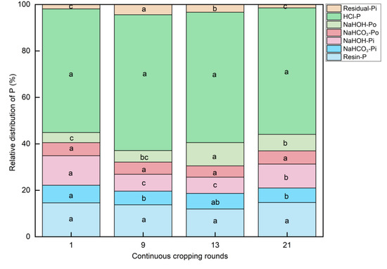 The relative distribution of P fraction in 0–20 cm soil under long-term continuous cropping. The different letters indicate the significant differences among the treatments on p < 0.05.