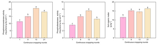 Effects of different continuous cropping rounds on soil phosphomonoesterase, phosphodiesterase activity, and soil organic matter for the greenhouse soil. The different letters indicate the significant differences among the treatments on p < 0.05.