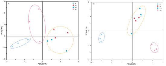 The structural characteristics of the soil microbial communities were determined using a PLFA method [23]. Extraction was carried out using the KOH-methanol solution methyl ester method; 19:0 methyl ester was added to the esterified samples as an internal standard. An Agilent GC 7890B gas chromatograph was used for fatty acid comparison and identification using the Sherlock Microbial Identification System (MIS) developed by the MIDI Company. The 13C value of each fatty acid was determined using a gas chromatography combustion isotope mass spectrometer (GC-IRMS, MAT 253, Thermo Fisher). The characterization of the microbial PLFAs is shown in Table 3.