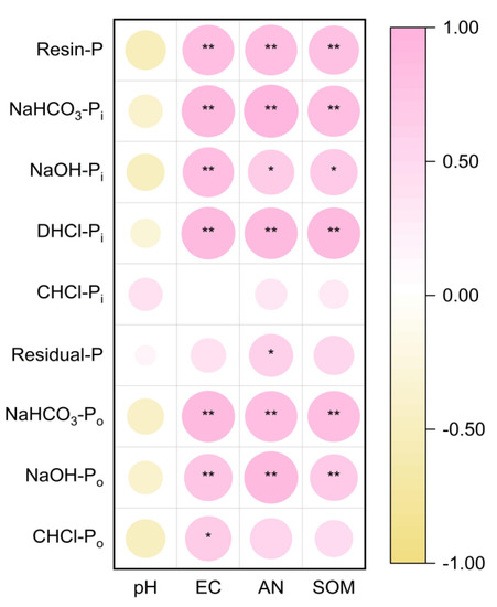 The Pearson correlation analysis for soil chemical properties and P fractions under long-term continuous cropping. The size of the circle indicates the size of the Pearson correlation coefficient, and the larger the circle, the larger the coefficient. EC, electrical conductivity; AN, available nitrogen; and SOM, soil organic matter. * and ** indicate significant correlation at p < 0.05 and 0.01 levels, respectively.