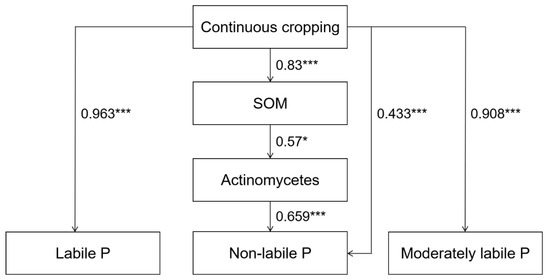 An SEM model was used to elucidate the relationships between soil P fraction, chemical properties, and microbial community composition under long-term continuous cropping. The model fitting results were χ2 = 6.423, DF = 7, CFI = 1.000, AIC = 46.423, and RMSEA = 0.000, indicating that the model fit well. Long-term single continuous cropping itself led to the accumulation of soil labile P, moderately labile P, and non-labile P. Continuous cropping also significantly affected the soil SOM content, and SOM had a significant positive effect on the abundance of actinomycetes, which indirectly promoted the accumulation of non-labile P in the soil (Figure 8).