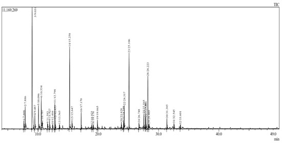 Chromatograph of compounds identified by GC/MS in EOs of J. thurifera. Peaks represent absolute abundances, whereas numbers on the x-axis represent retention times in min.