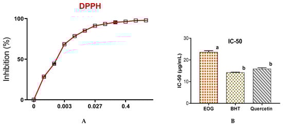 Antioxidant activities of EOs of J. thurifera by the DPPH method (A) and the concentration of IC-50 (B). Bars with the same letters do not differ significantly (p < 0.05).