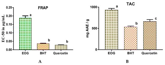 Antioxidant activities of EOs of J. thurifera by the FRAP method (A) and antioxidant capacity of EOs of J. thurifera (B). Bars with the same letters do not differ significantly (p < 0.05).