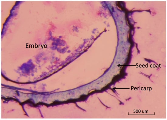 Thin sectioning for visualization was as follows: (1) Seeds were placed in 10% formalin, (2) dehydrated in a tissue processor (Leica EM, Buffalo Grove, IL, USA) in formalin, 70% alcohol, 80% alcohol, 3 changes of 95% alcohol, 3 changes of 100 % alcohol, 2 changes of xylene, and 4 changes of liquid paraffin wax. Tissue-processor steps included 1 h of duration for all solutions except paraffin, which was 30 min. each. (3) Dehydrated seed samples were imbedded into paraffin and (4) cut with a rotary microtome into 4-micron sections. The thin sections were floated on water and picked up on microscope slides. Slides were dried at 60 °C for 20 min. with forced air to melt paraffin so that the tissue would adhere to each slide and remove excess water. (5) Paraffin was removed in 2 changes of xylene for 3 min. each. Slides were next rehydrated in 95% alcohol, 2 changes for 3 min. each, and then rinsed in running tap water in an automated stainer. (6) Slides were next rinsed in distilled water and (7) stained in 0.002% toluidine blue for 4 min. and dehydrated sequentially in 95%, 100% alcohol, and 95% xylene. (8) Samples were protected by cover slips attached with resinous mounting media.