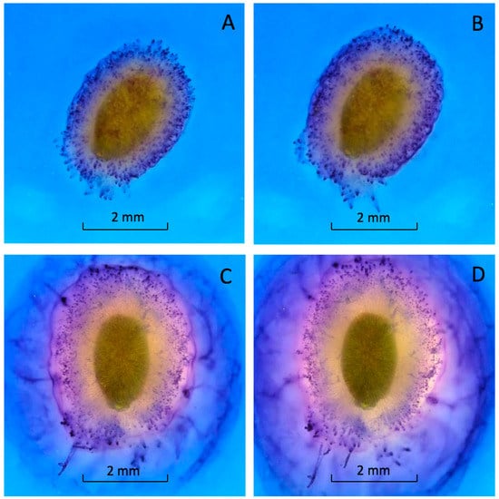 Basil is classified in the family Lamiaceae. Some members are myxocarpic and exude polysaccharide upon hydration from fruit the pericarp surrounding the seed [5]. Mucilage excretion increased the total volume of hydrated basil seeds five-fold compared to dry seeds (Figure 2A,B).