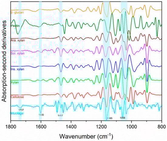 Basil-seed-mucilage chemical composition determined nondestructively by Fourier-transform mid-infrared (FTIR) spectroscopy. Second derivatives of FTIR absorption spectra of basil-seed mucilage (mucilage), cellulose, xylan, insoluble xylan, (Ins. xylan), soluble xylan (Sol. xylan), arabinoxylan (Ara. xylan), apple pectin (pectin), and β-glucan.