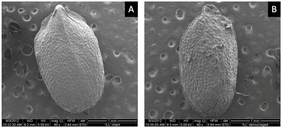 Dry intact basil-seed images of sputter coating prior to viewing by ESEM. Mucilage-producing seed (A), seed with mucilage removed (B).