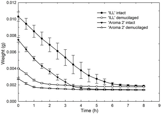 The hydration (Figure 6) and dehydration (Figure 7) time courses for seeds with and without the mucilage showed distinctive phases. The hydration of both basil cultivars produced similar bimodal seed-imbibition curves with two distinct plateaus. The first increase occurred during the initial 15 min. and corresponded with the hydration of the mucilage layer of the pericarp (Figure 6). The water content increased at a slower rate during the next 3 h until seeds were fully hydrated, when the water content reached a second plateau. Seeds without mucilage produced a single-plateau hydration curve for both cultivars (Figure 6).