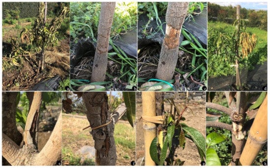 - Guarnaccia, V.; Vitale, A.; Cirvilleri, G.; Aiello, D.; Susca, A.; Epifani, F.; Perrone, G.; Polizzi, G. Characterisation and pathogenicity of fungal species associated with branch cankers and stem-end rot of avocado in Italy. Eur. J. Plant Pathol. 2016, 146, 963–976. [Google Scholar] [CrossRef]