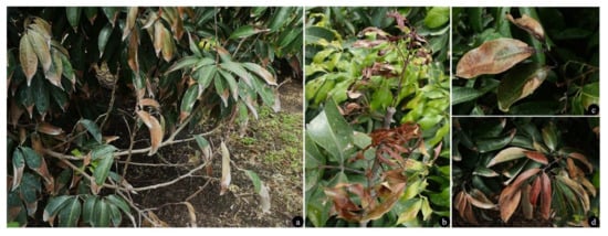 Symptoms of woody canker and shoot blight on litchi plants. (a) Twig blight and defoliation; (b) shoot blight; (c,d) leaf blight.