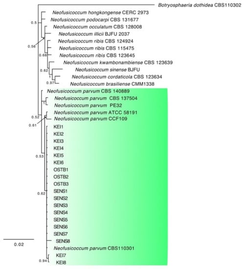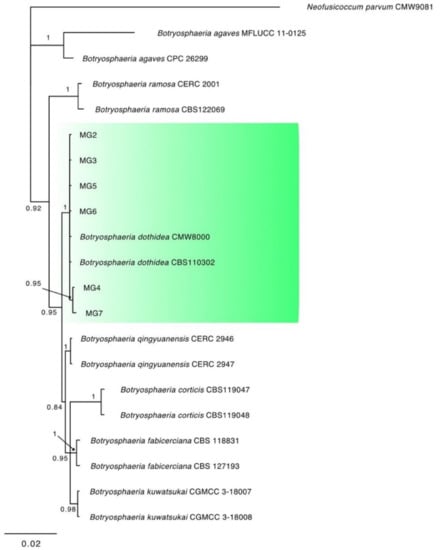 Consensus phylogram of 6392 trees resulting from a Bayesian analysis of the combined ITS, tef1, and tub2 sequence of Neofusicoccum species. The tree was rooted to Botryosphaeria dothidea (CBS110302). Bayesian posterior probability values are indicated at the nodes. The cluster containing the isolates obtained in this study is highlighted in green.